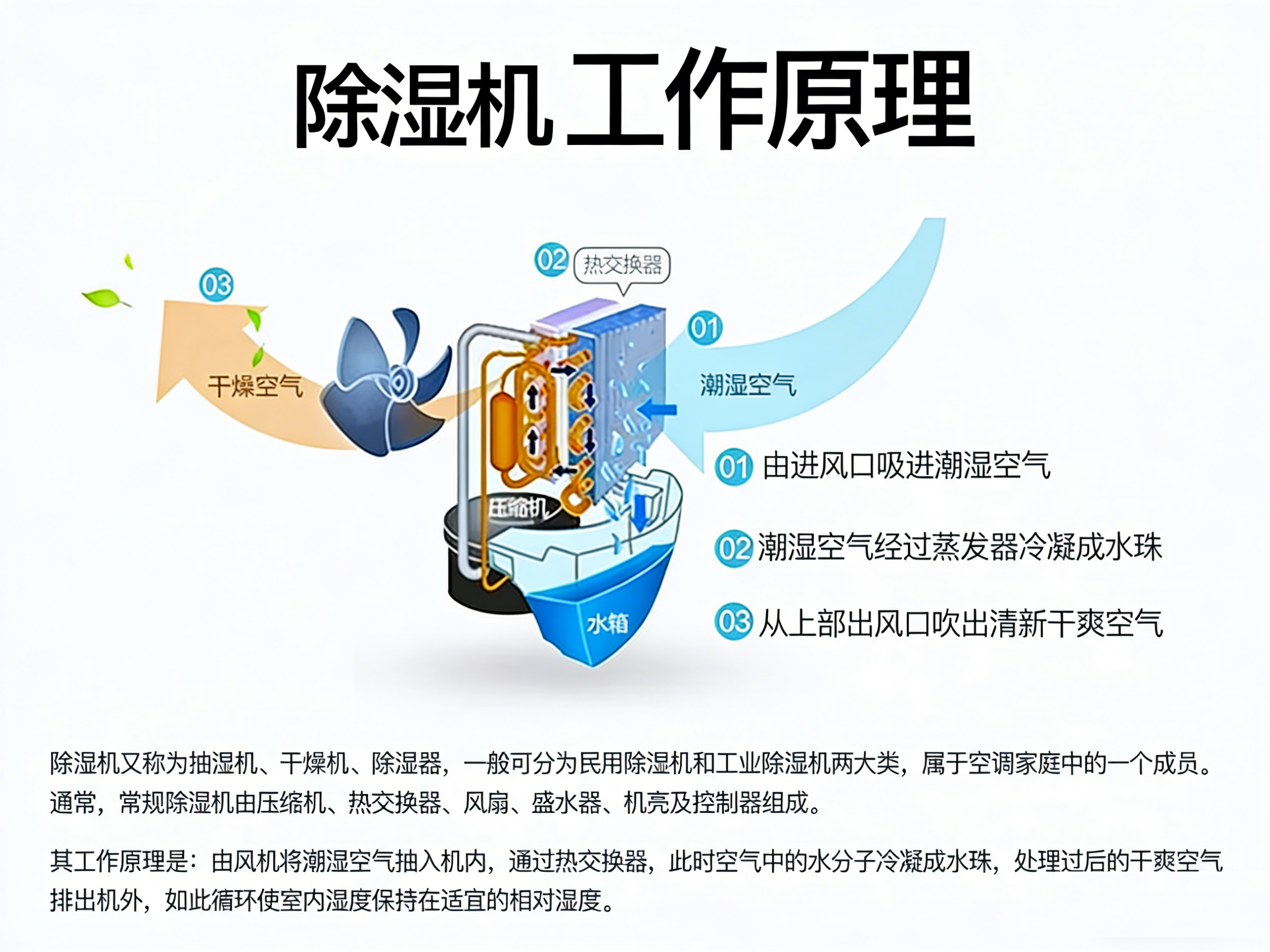 其工作原理是:由风机将潮湿空气抽入机内,通过热交换器,此时空气中的水分子冷凝成水珠,处理过后的干爽空气排出机外,如此循环使室内湿度保持在适宜的相对湿度。