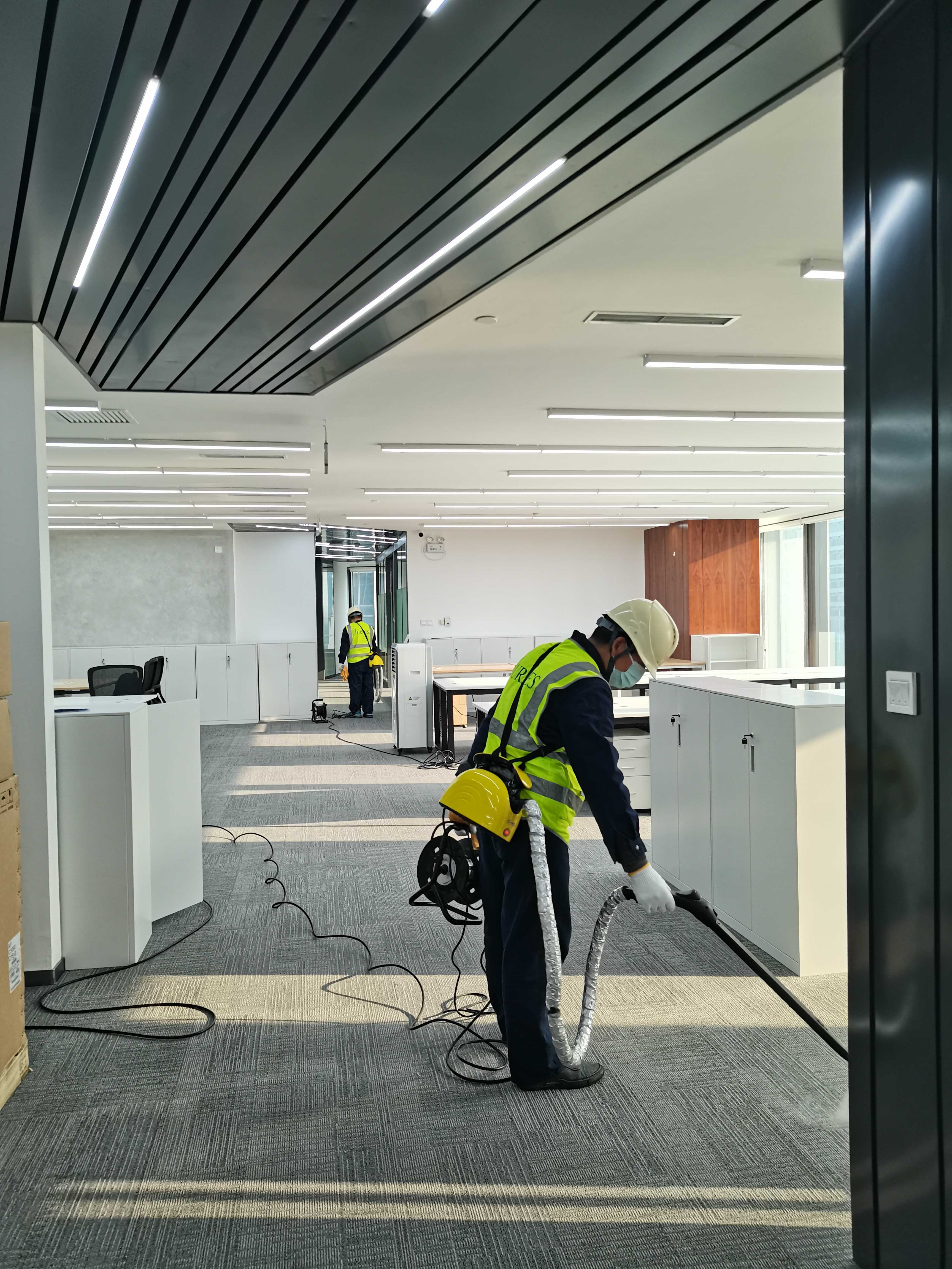 项目为集团总部新办公楼,总建筑面积3500㎡,共2层,涵盖大型开放式办公区(200个工位)、6间会议室、1间大型培训室、8间高管办公室、茶水间及走廊区域;装修采用批量定制办公家具、石膏板吊顶、乳胶漆墙面、实木地板,装修完工后因异味严重,无法正常入驻,需快速完成治理并通过验收。