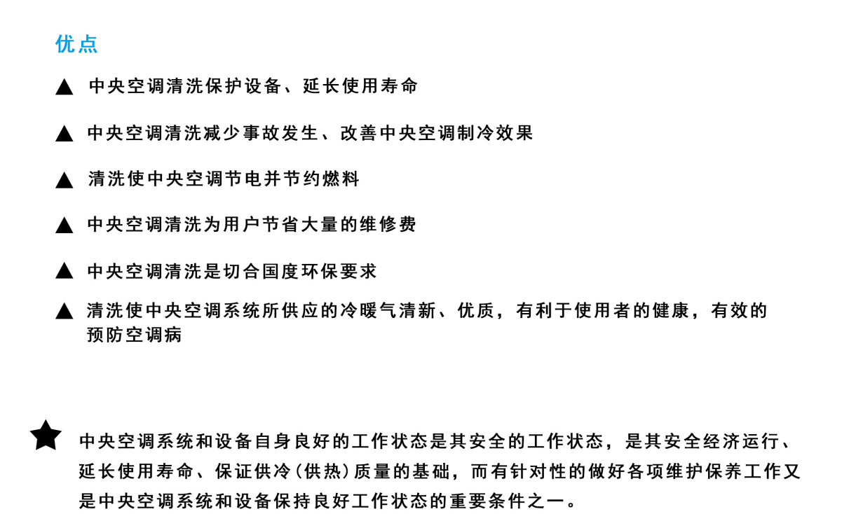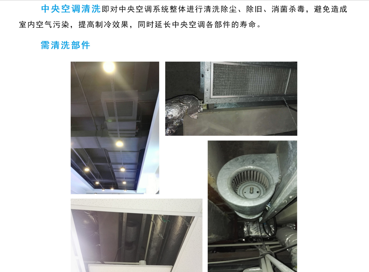 中央空调清洗包括四个部分,分别是通风管道清洗、末端清洗、主机清洗以及水处理;通风管道和末端的清洗关乎室内空气的质量,直接影响人们身体健康;主机清洗以及水处理清洗关系到设备的使用寿命、能耗和故障率,为保障中央空调系统正常运行为恰当的做法是每年清洗1-2次。