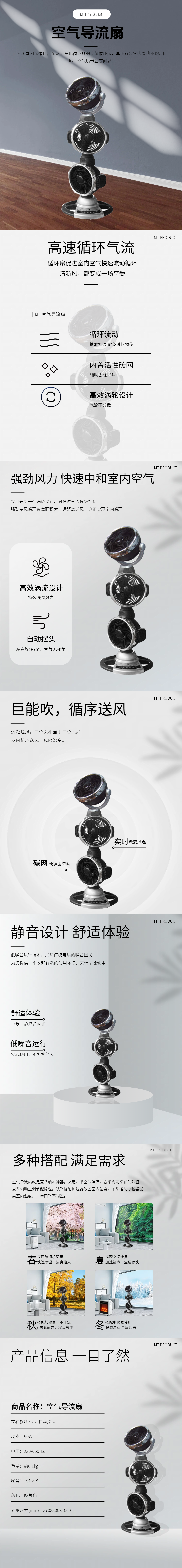 功能适用:迅速中和室内空气,可辅助冷热风迅速产生空气对流效果内置活性碳网辅助去除异味